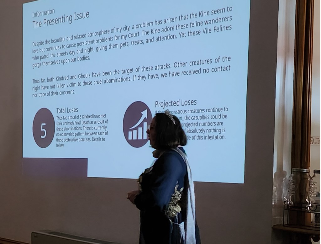 From there, if possible, I worked with them on backstories, on how they became Princes, and especially on what they were bringing to the table. I posted out to each of them a document some 5-6 pages long with an in-character letter from the proprietor of the location they’d be going to and names of other Princes and who their characters were friends [or enemies] with for a little flavour. Then, I included information that explained everything in the letter. It told them what dress style suited their groupings, WHY they were friends/enemies with those people, but most importantly, it explained who their characters were, what being a vampire in this setting meant to them.