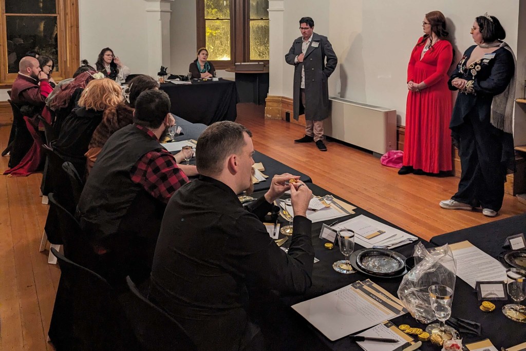 Thankfully, it was all booked easily. They were amazing, and because they do deals with not-for-profits we were able to get into the location 2 hours before start, and stay for 2 hours after finish for set-up and pack down for no extra charge. And thanks be to everything, my regular players who usually help with the same things at the regular game stuck around to help us do that, even though they’d been in character for 12 hours in formalwear. Really couldn’t have done it without them, honestly.