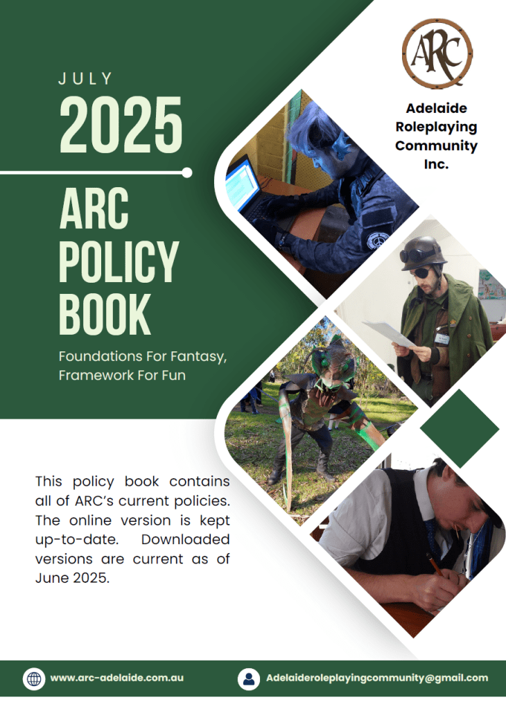 Provided to all new members, this handbook provides helpful information on membership levels, benefits, safety and calibration techniques, physical combat and how to be a great player or NPC in Adelaide Roleplaying Community Inc.